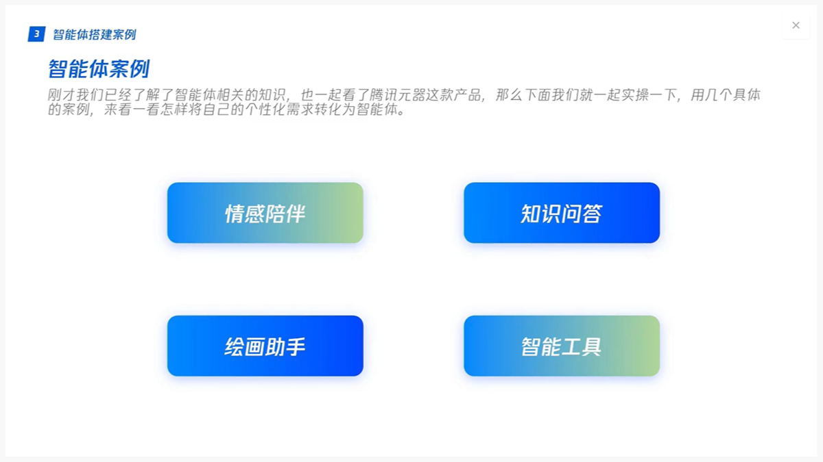 - 课程内容:深入讲解智能体基础概念、腾讯元器平台操作及智能体构建实例。智能体作为基于大语言模型的智能系统,适用情感陪伴、知识问答等多种场景。