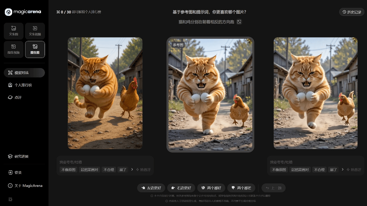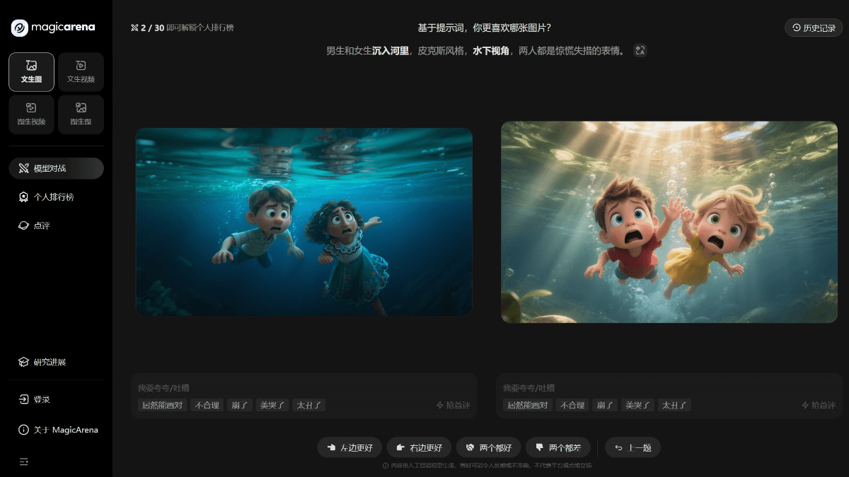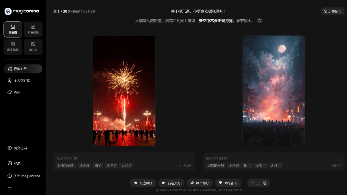比较投票:查看不同模型生成的结果,对生成效果进行比较并投票。